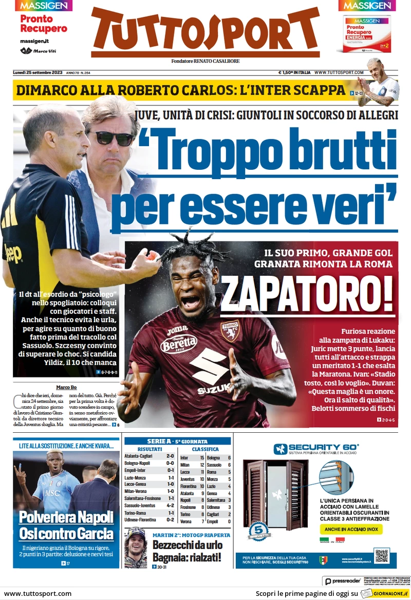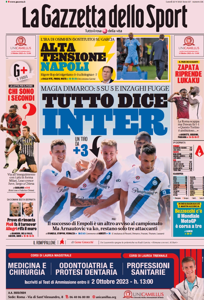 Le prime pagine dei quotidiani sportivi in edicola lunedì 25 settembre