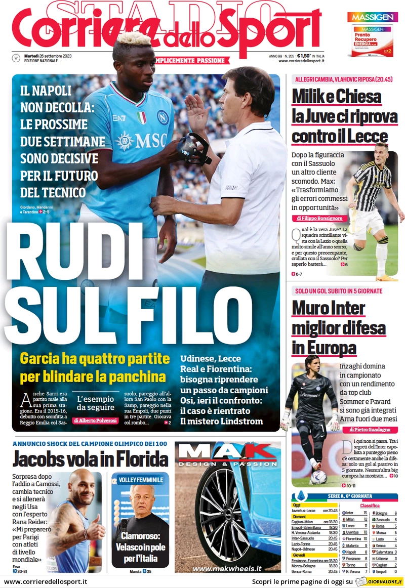 Le prime pagine dei quotidiani sportivi in edicola martedì 26 settembre