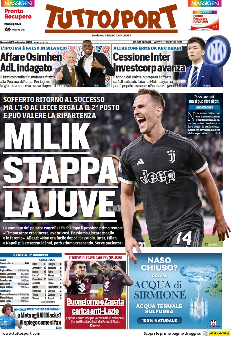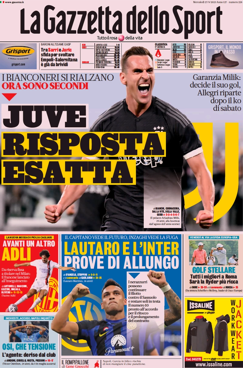 Le prime pagine dei quotidiani sportivi in edicola mercoledì 27 settembre