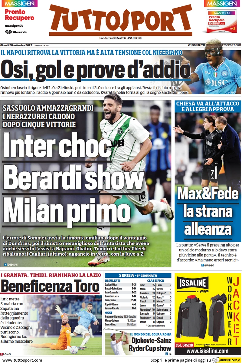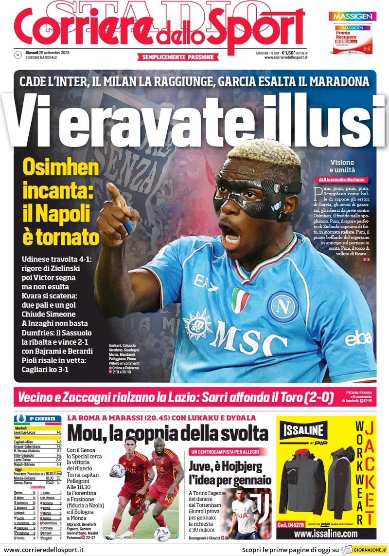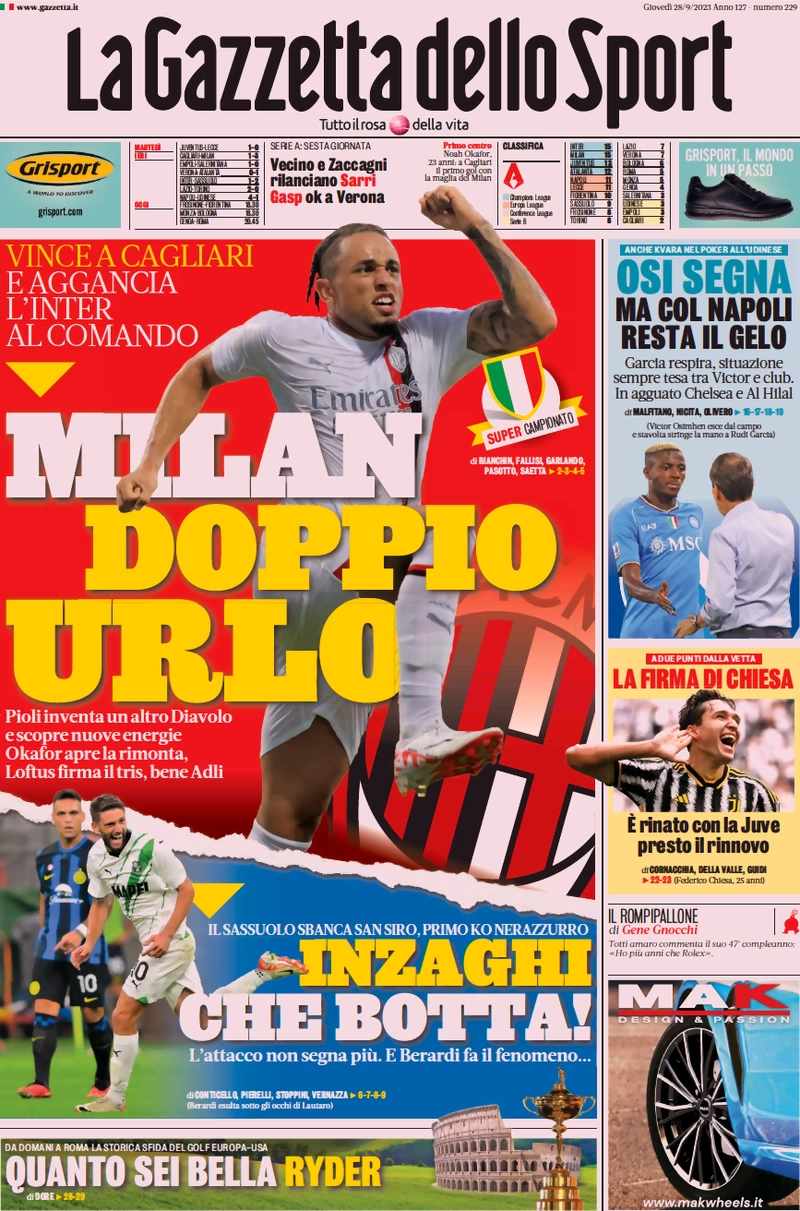 Le prime pagine dei quotidiani sportivi in edicola giovedì 28 settembre
