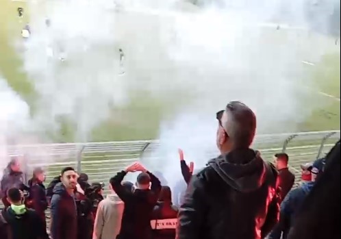 Cori e fumogeni dalle tribune del Centro Sportivo Real Cosenza da parte degli ultras rossoblù...