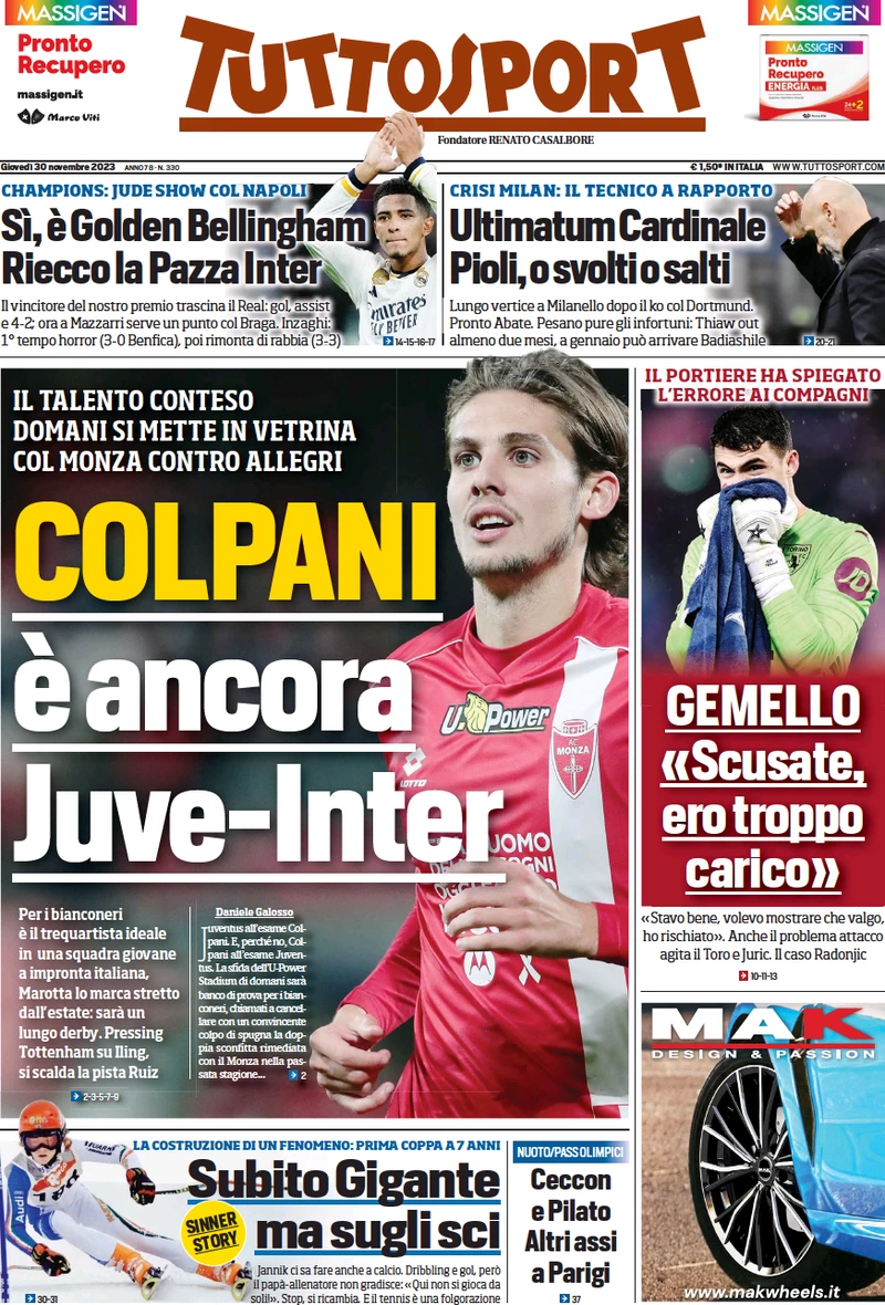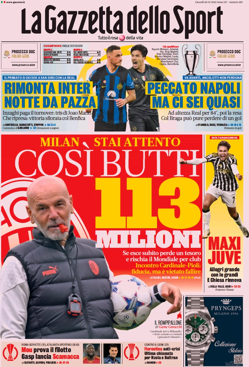 Le prime pagine dei quotidiani sportivi in edicola giovedì 30 novembre