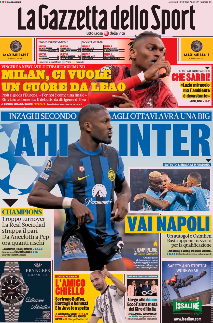 Le prime pagine dei quotidiani sportivi in edicola mercoledì 13 dicembre