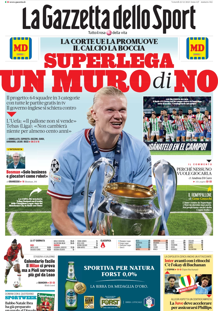 Le prime pagine dei quotidiani sportivi in edicola venerdì 22 dicembre