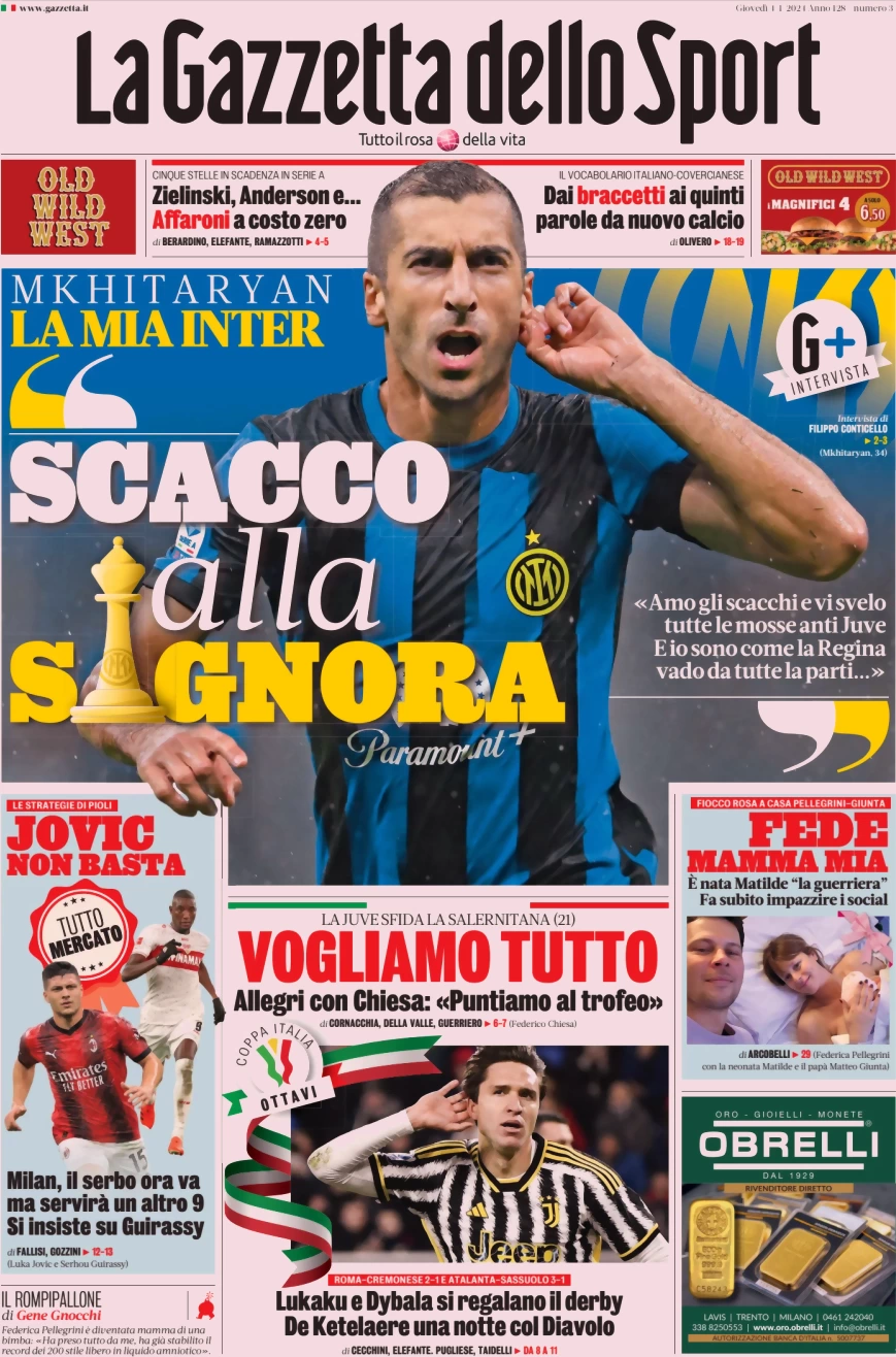 Le prime pagine dei quotidiani sportivi in edicola giovedì 4 gennaio