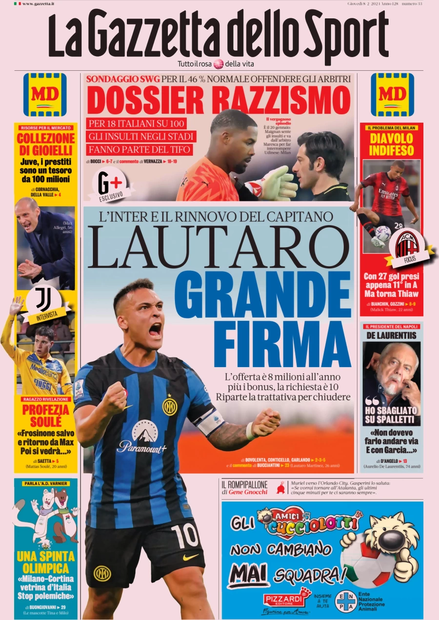 Le prime pagine dei quotidiani sportivi in edicola giovedì 8 febbraio