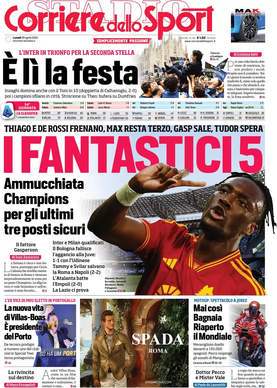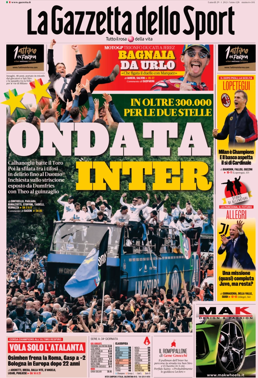 Le prime pagine dei quotidiani sportivi in edicola lunedì 29 aprile