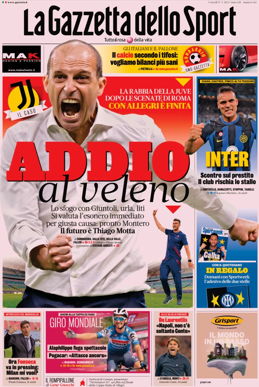 Le prime pagine dei quotidiani sportivi in edicola venerdì 17 maggio