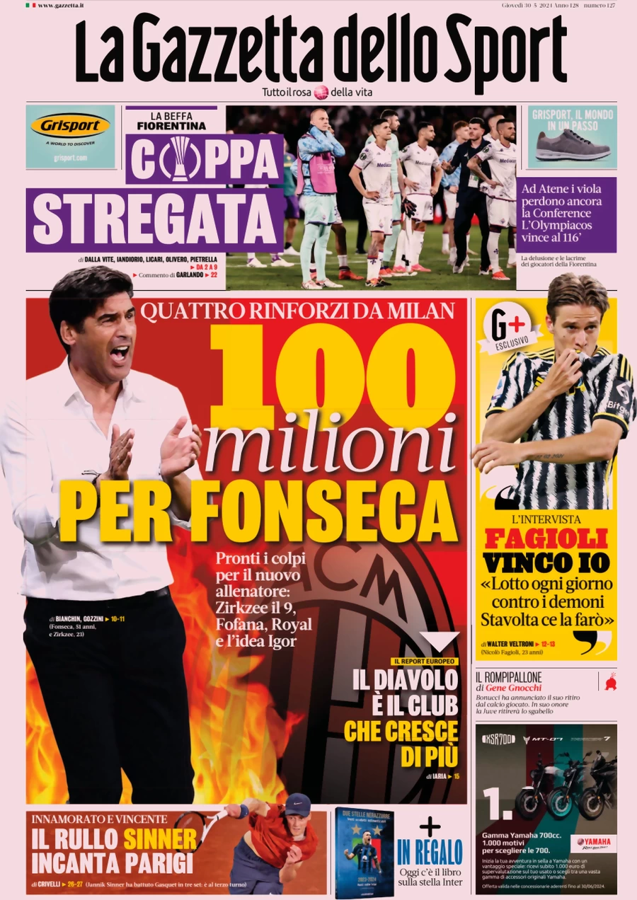 La redazione di calciocatanzaro.it propone ai lettori le prime pagine dei tre quotidiani sportivi in edicola oggi, giovedì 30 maggio 2024