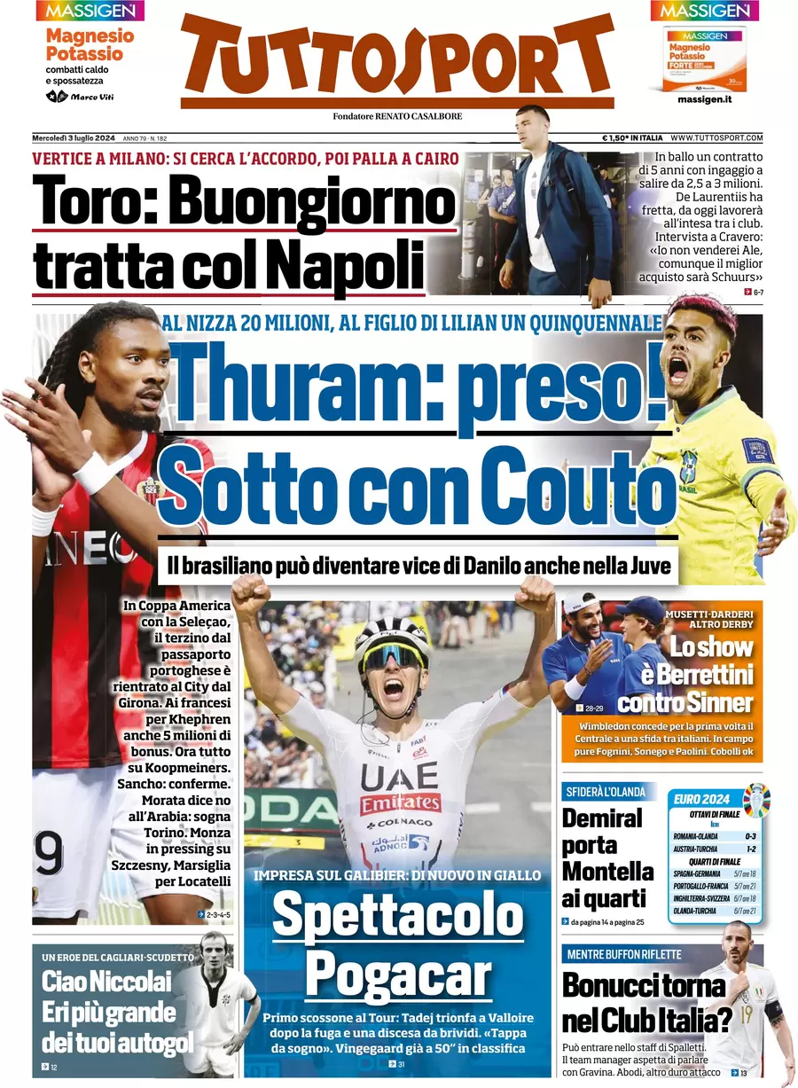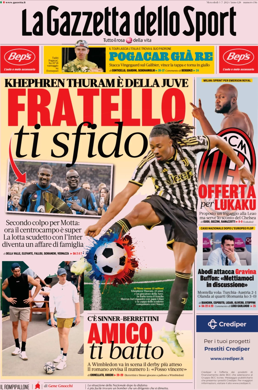 Le prime pagine dei quotidiani sportivi in edicola mercoledì 3 luglio