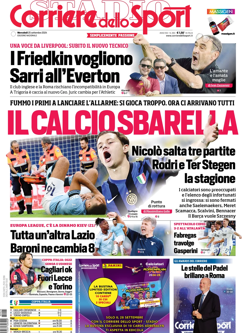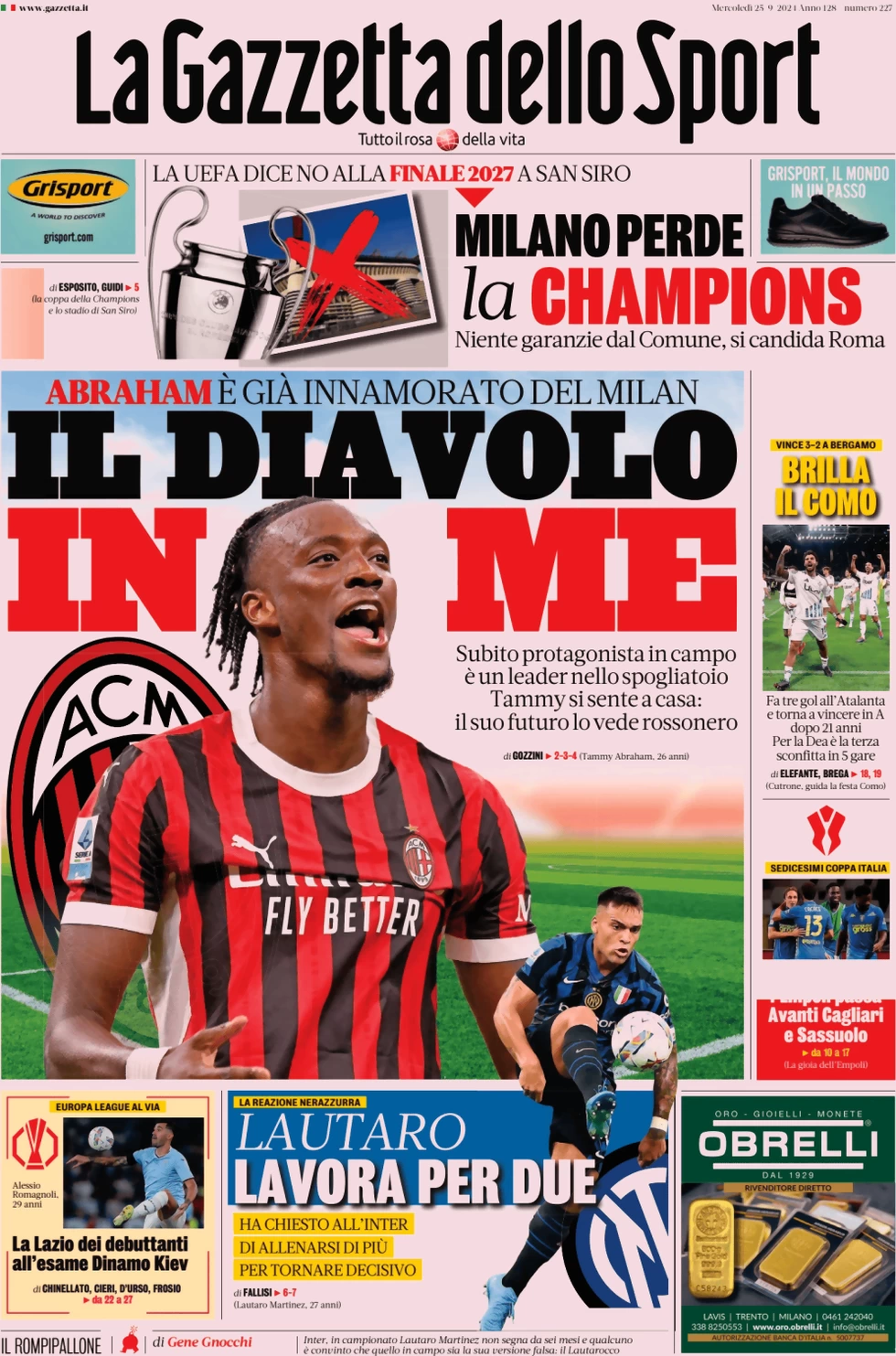 Le prime pagine dei quotidiani sportivi in edicola mercoledì 25 settembre