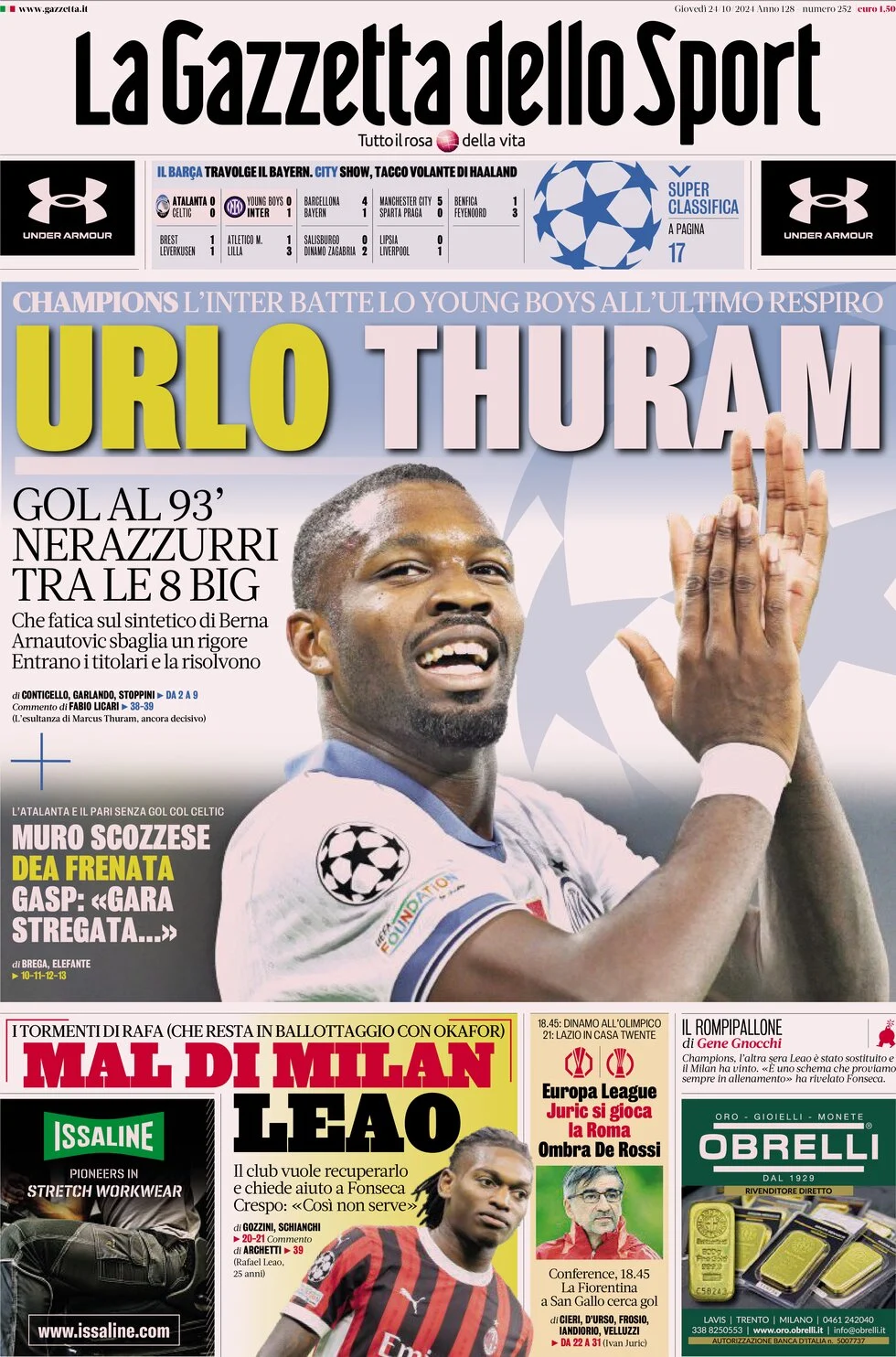 Le prime pagine dei quotidiani sportivi in edicola giovedì 24 ottobre