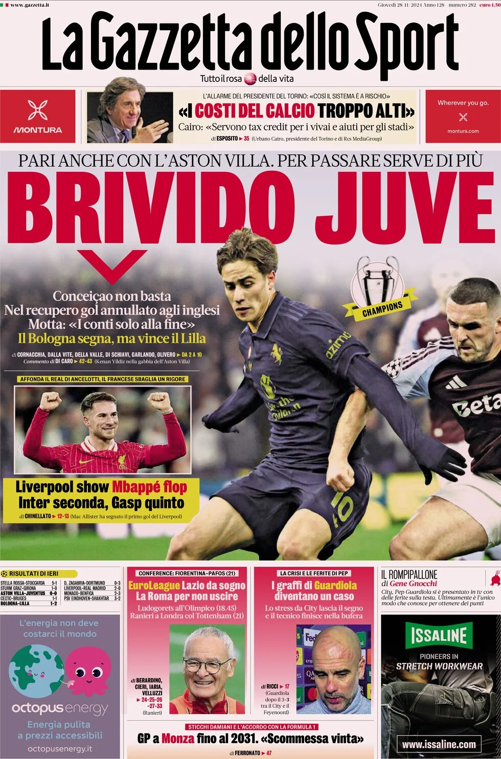Le prime pagine dei quotidiani sportivi in edicola giovedì 28 novembre