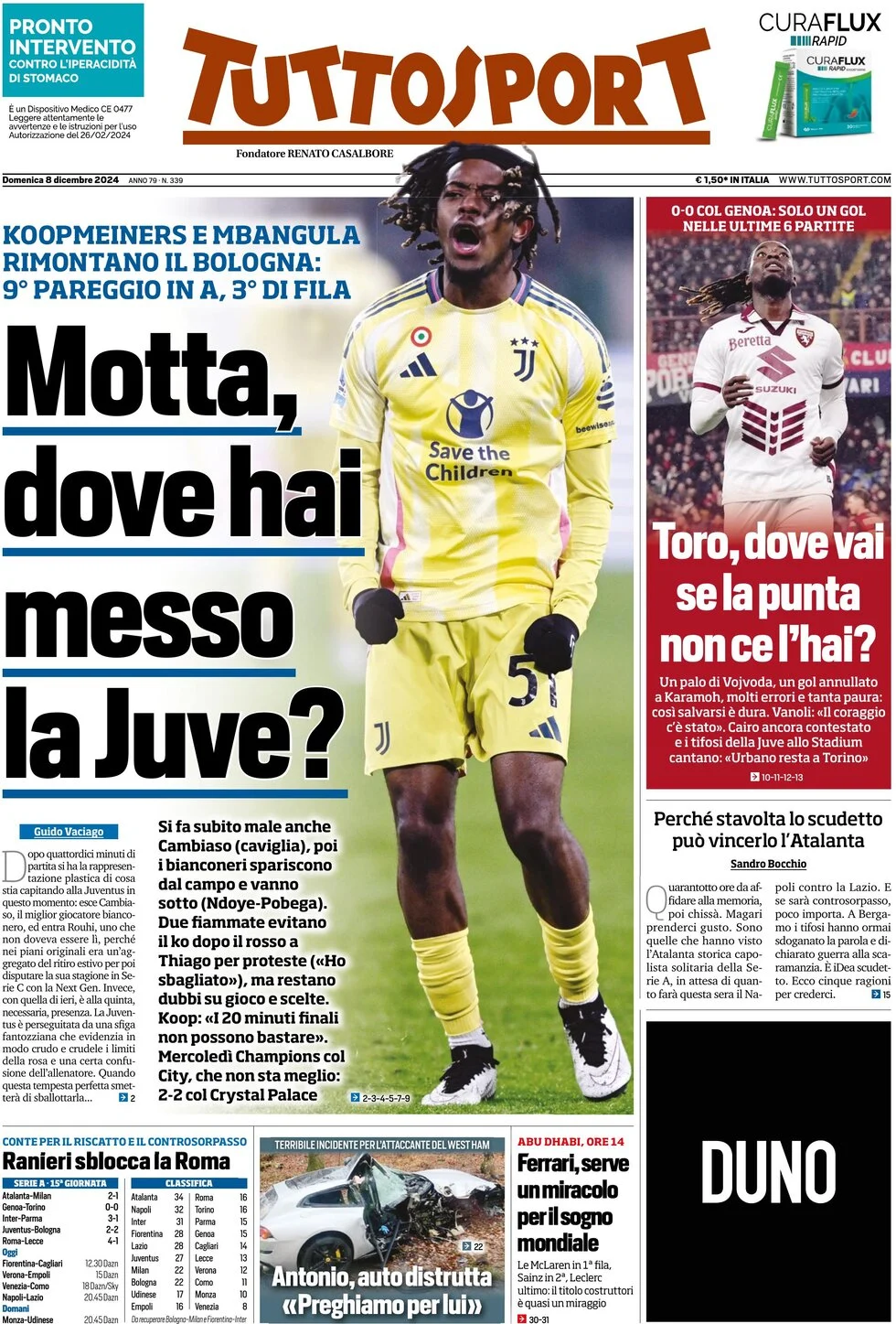 Le prime pagine dei quotidiani sportivi in edicola domenica 8 dicembre