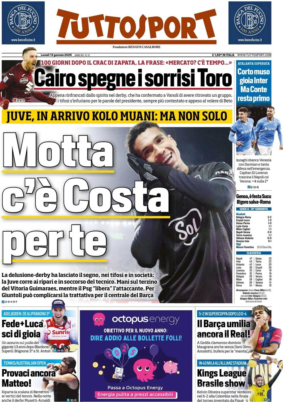 Le prime pagine dei quotidiani sportivi in edicola lunedì 13 gennaio