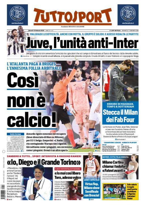 Le prime pagine dei quotidiani sportivi in edicola giovedì 13 febbraio