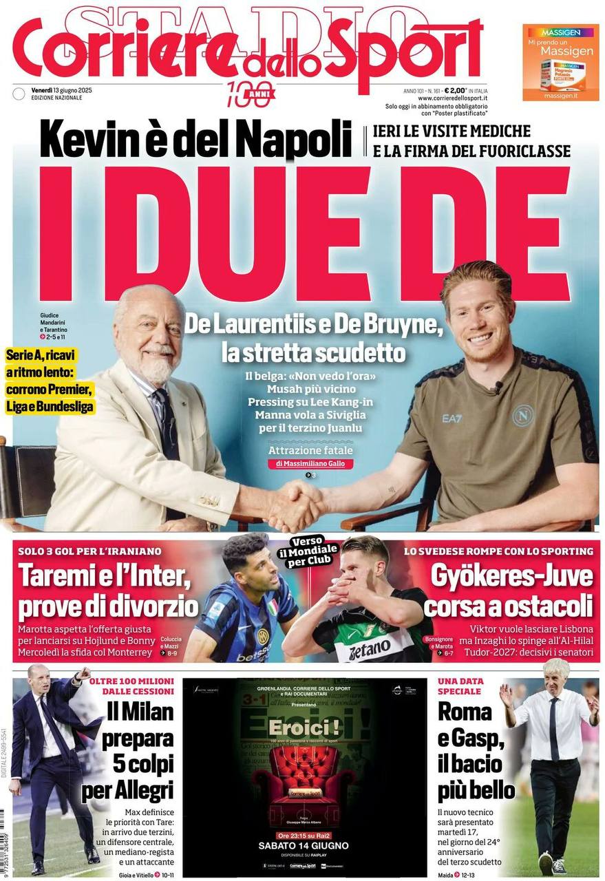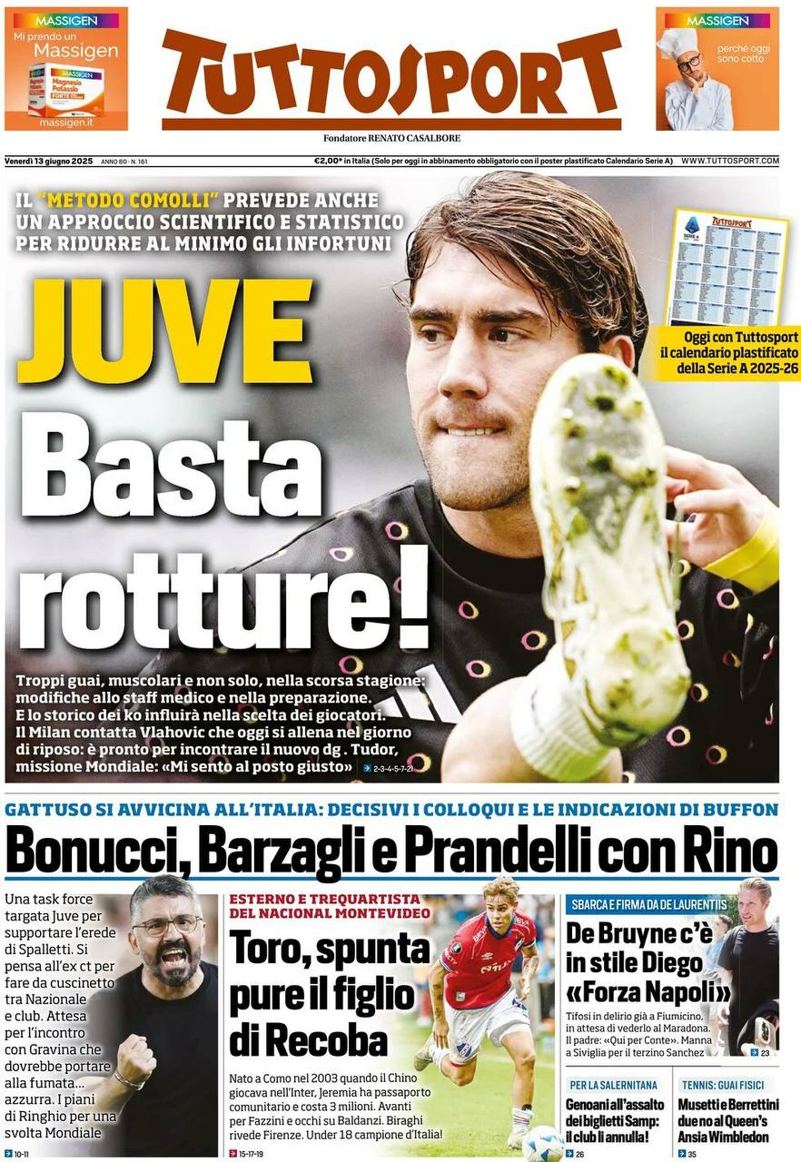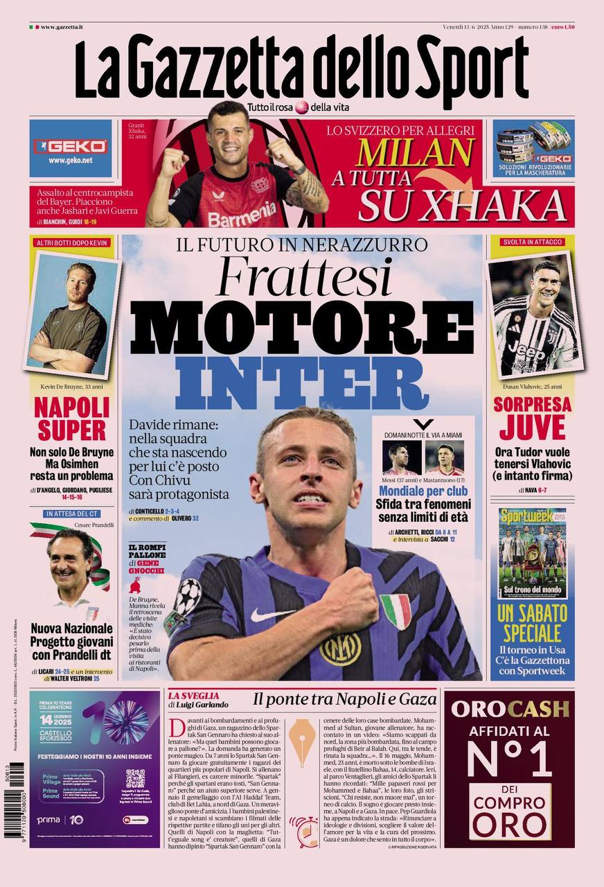 La redazione di calciocatanzaro propone ai lettori le prime pagine dei tre quotidiani sportivi in edicola oggi, venerdì 13 giugno 2025