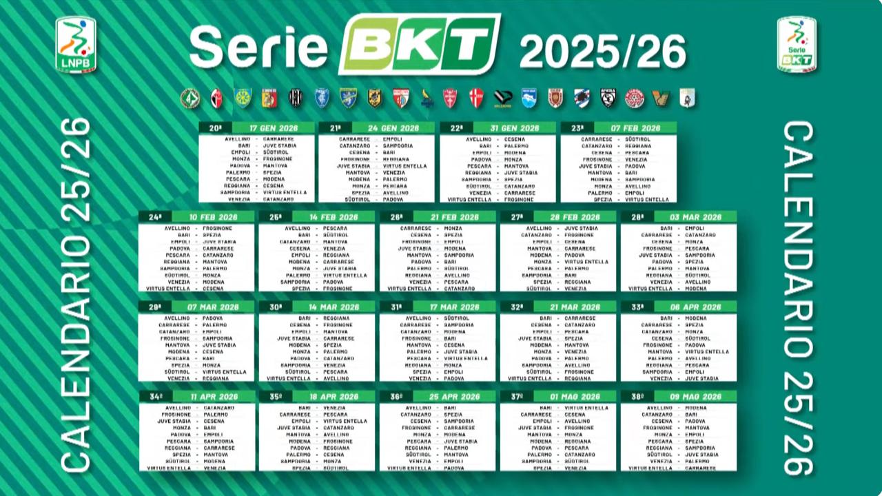È stato sorteggiato a Palazzo Te, nella città di Mantova, il calendario del campionato di Serie B 2025-2026. Dopo quelle del girone d’andata sono state svelate anche tutte le partite che il Catanzaro si troverà davanti nel girone di ritorno della 94ª edizione del torneo cadetto. I giallorossi guidati da Alberto Aquilani inaugureranno l’anno nuovo sul campo del neo-retrocesso Venezia mentre chiuderanno la regular season tra le mura amiche con il Bari. Il 25 aprile giungerà lo Spezia al “Ceravolo” e l’1 maggio è prevista la prestigiosa trasferta di Palermo.