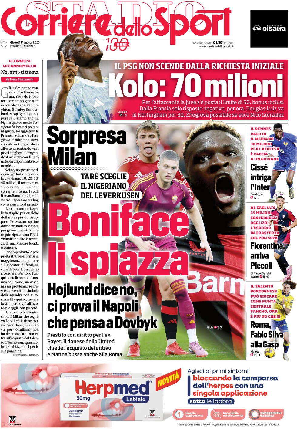 La redazione di calciocatanzaro propone ai lettori le prime pagine dei tre quotidiani sportivi in edicola oggi, giovedì 21 agosto 2025