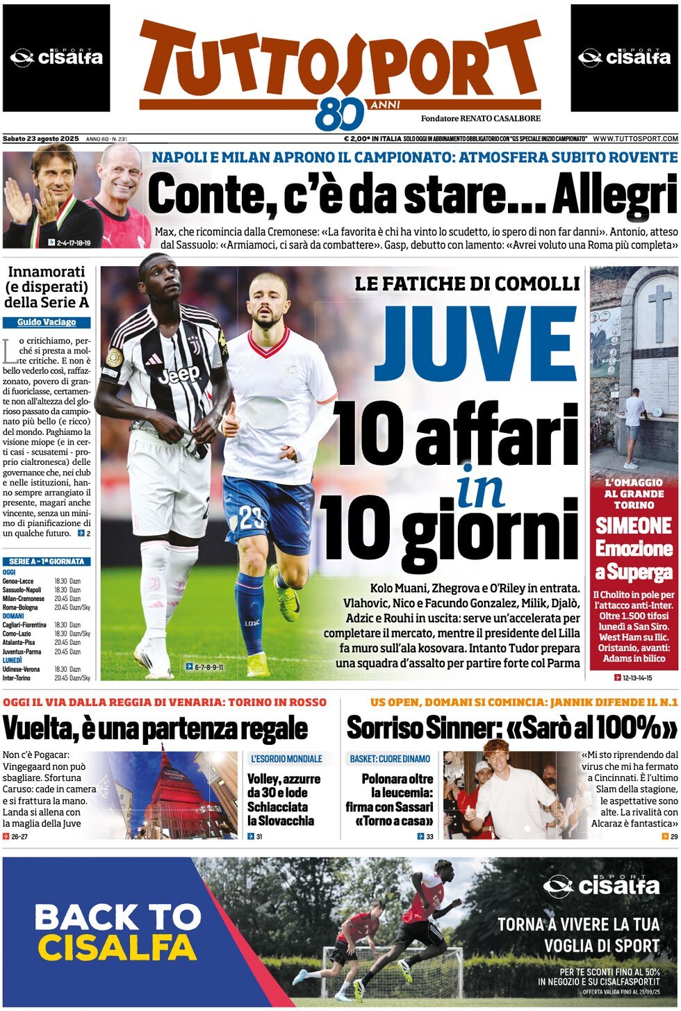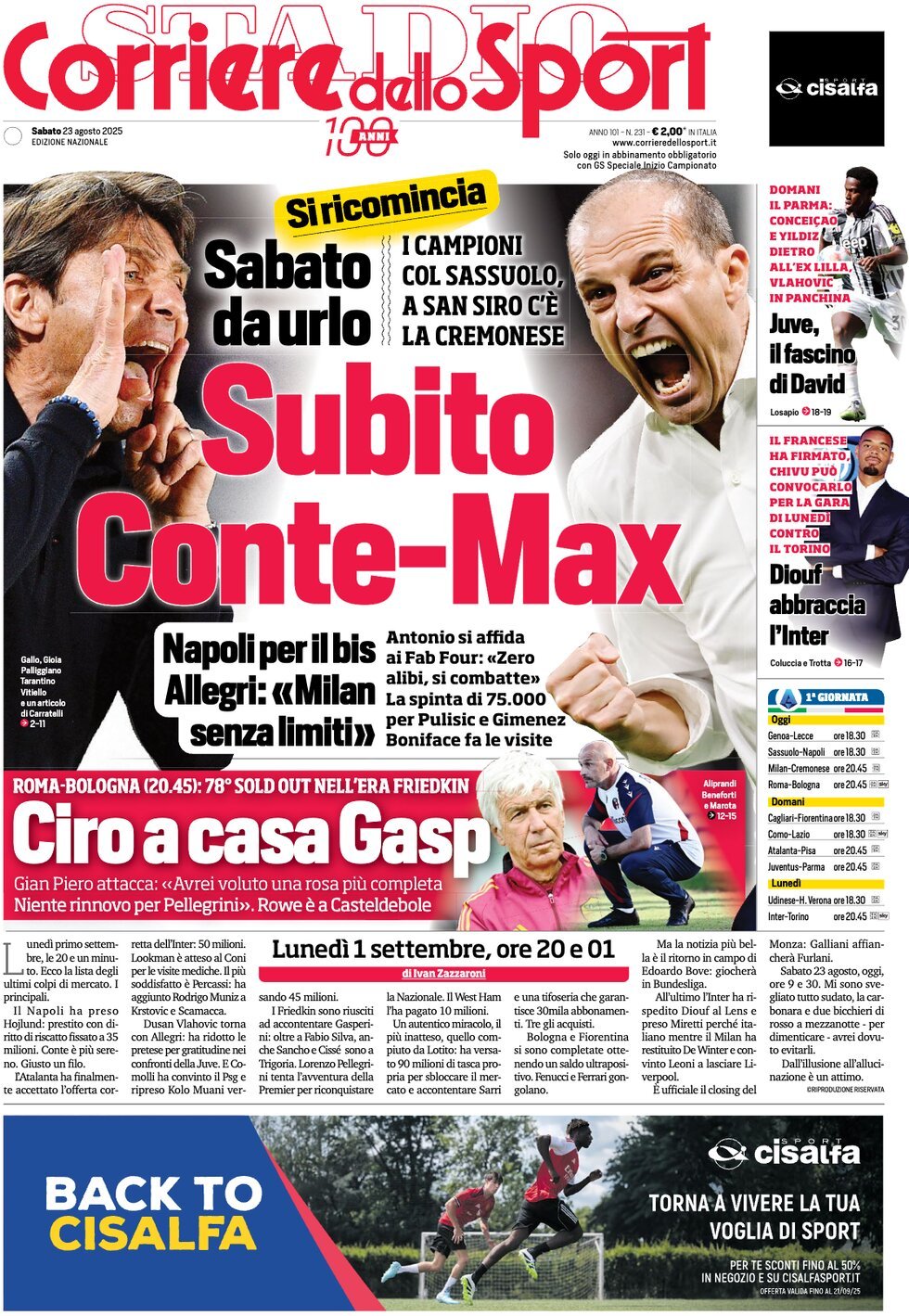 La redazione di calciocatanzaro propone ai lettori le prime pagine dei tre quotidiani sportivi in edicola oggi, sabato 23 agosto 2025