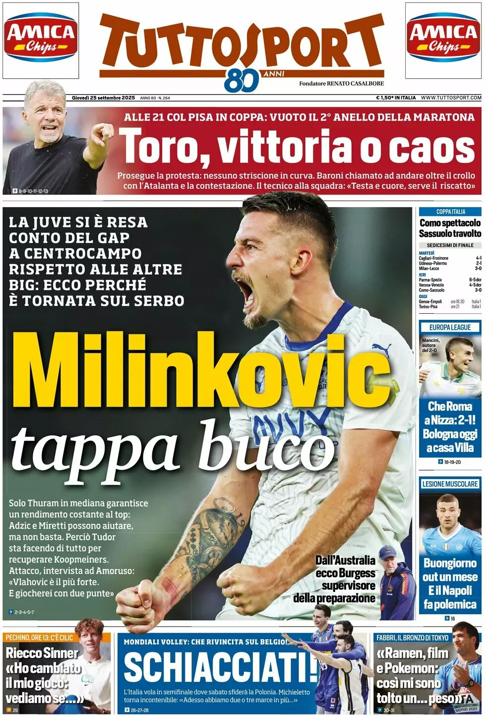 La redazione di calciocatanzaro propone ai lettori le prime pagine dei tre quotidiani sportivi in edicola oggi, giovedì 25 settembre 2025