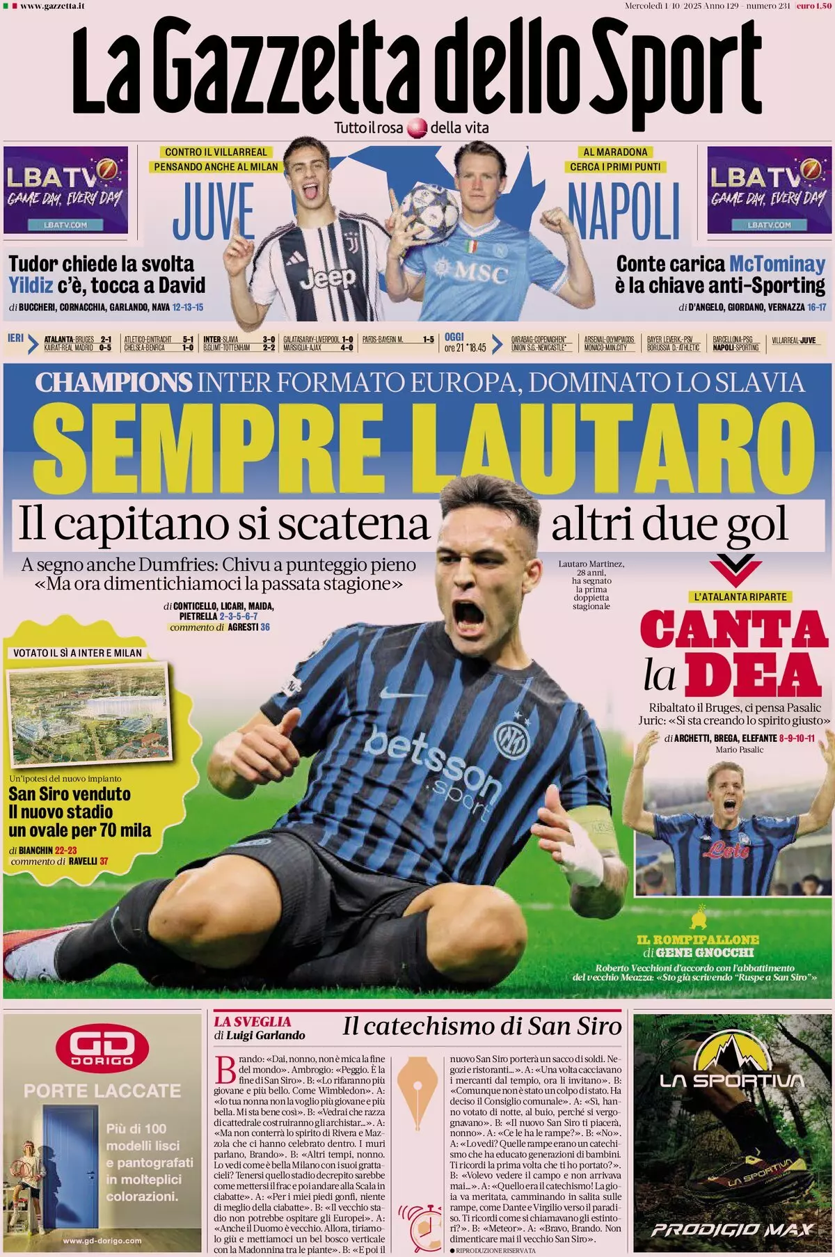 Le prime pagine dei quotidiani sportivi in edicola mercoledì 1 ottobre
