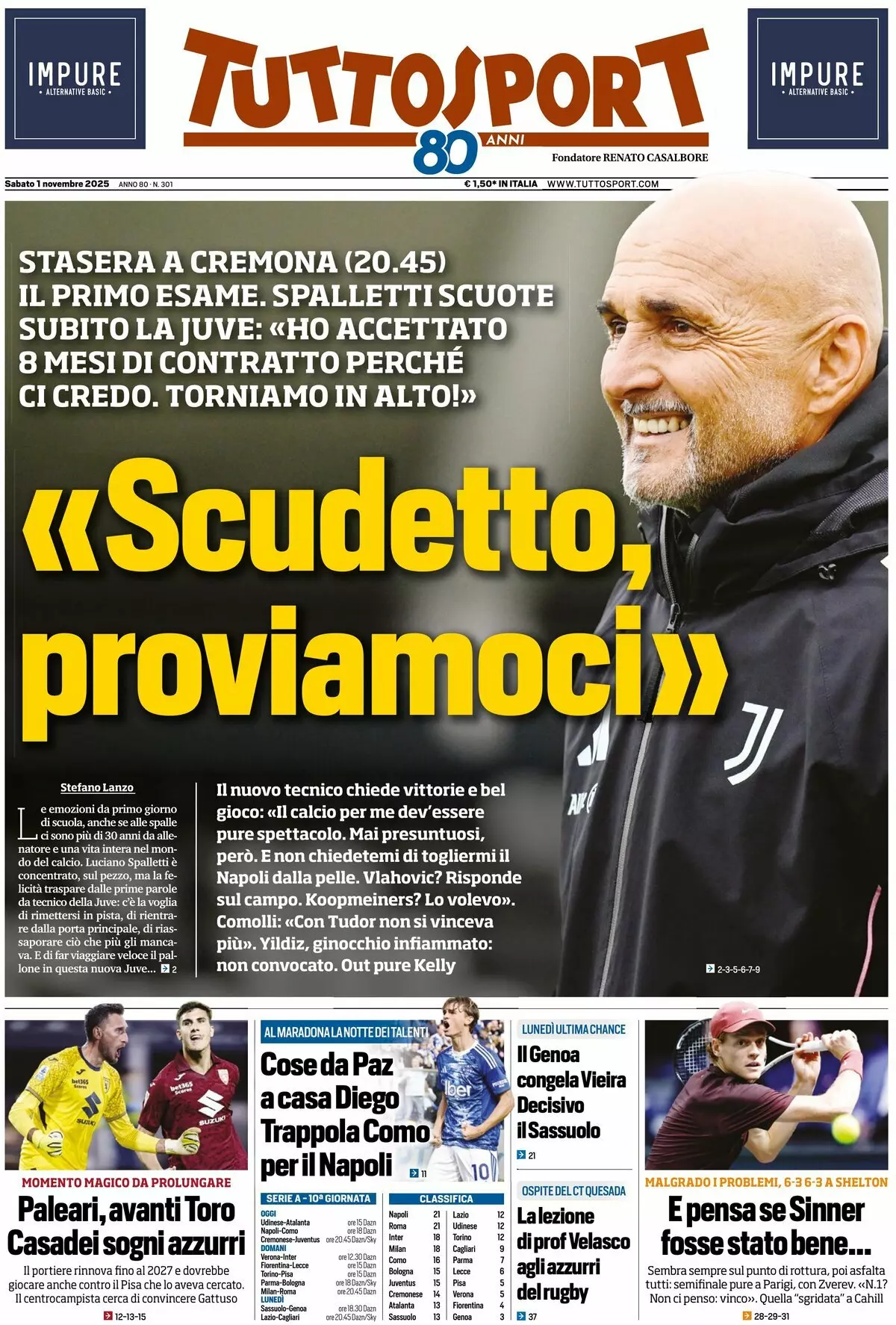 Le prime pagine dei quotidiani sportivi in edicola sabato 1 novembre