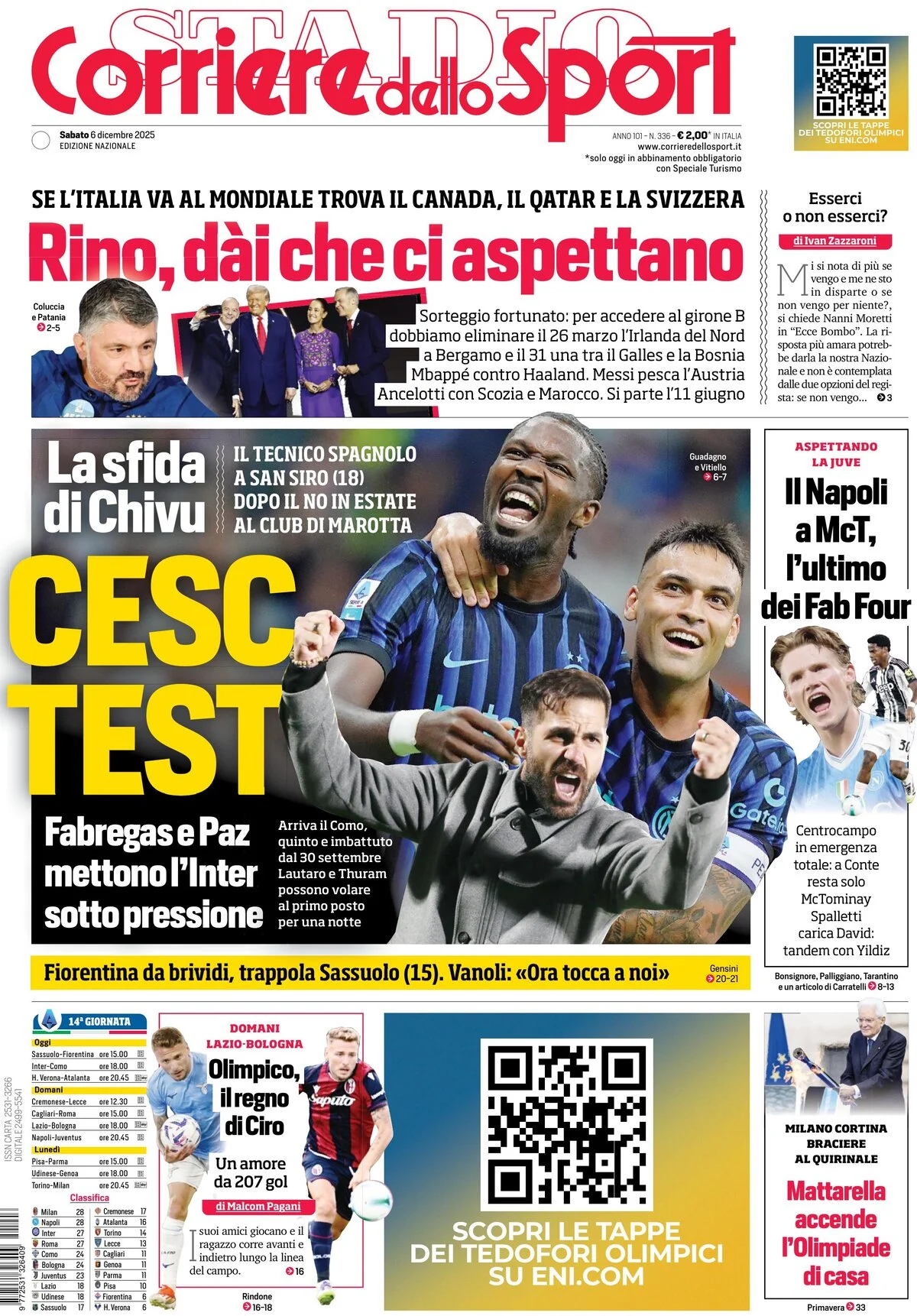 Le prime pagine dei quotidiani sportivi in edicola sabato 6 dicembre