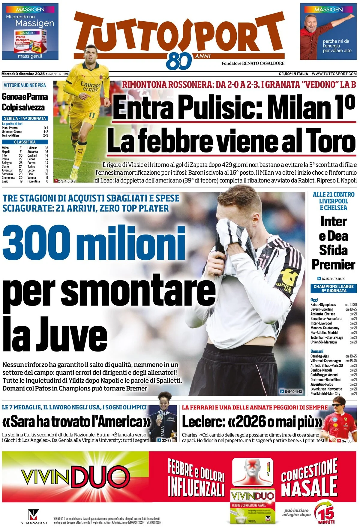 Le prime pagine dei quotidiani sportivi in edicola martedì 9 dicembre